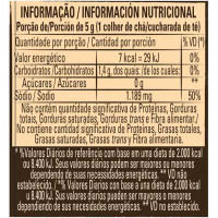 Sal, farinha de milho enriquecida com ferro e ácido fólico, óleo vegetal de palma, papaína, pimenta-do-reino, salsa, cebola, alho, realçador de sabor glutamato monossódico, antiumectante dióxido de silício, acidulante ácido cítrico, corante natural cúrcuma e aromatizantes.